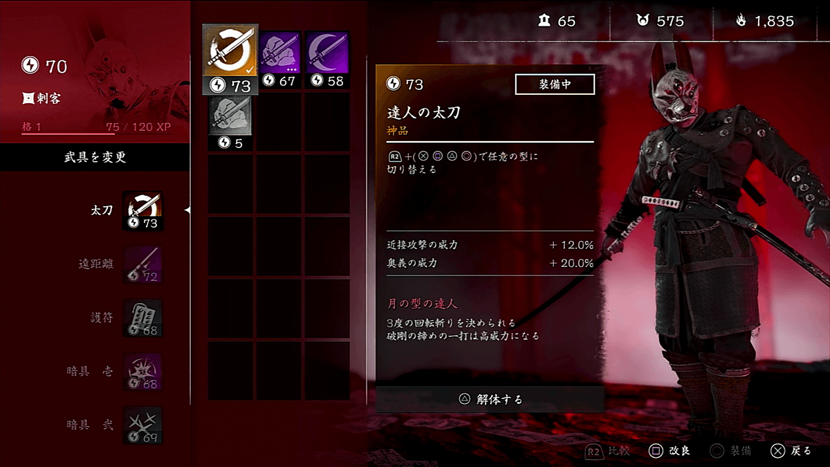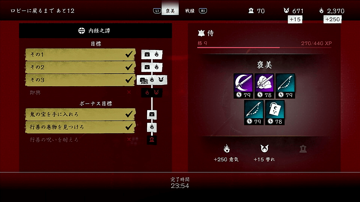 まず本アップデートをプレイして驚いたのが武具に名品や絶品といったレアリティが設定されており、それらを更新していくことで強くなる、いわゆる“ハック&スラッシュ”的な要素。武具は本編のように依頼を達成したり、神社に参拝して手に入れるのではなく、各モードクリア後に褒美として入手できるようになっている。武具にはさまざまな特殊効果があるため、自分好みのプレイスタイルを追求できるし、“役目”の特徴を伸ばしてロールプレイを堪能することも可能だ。