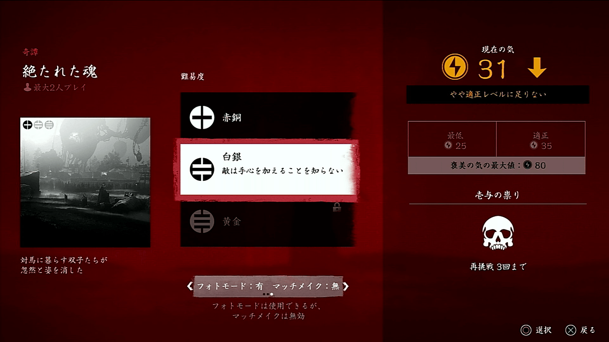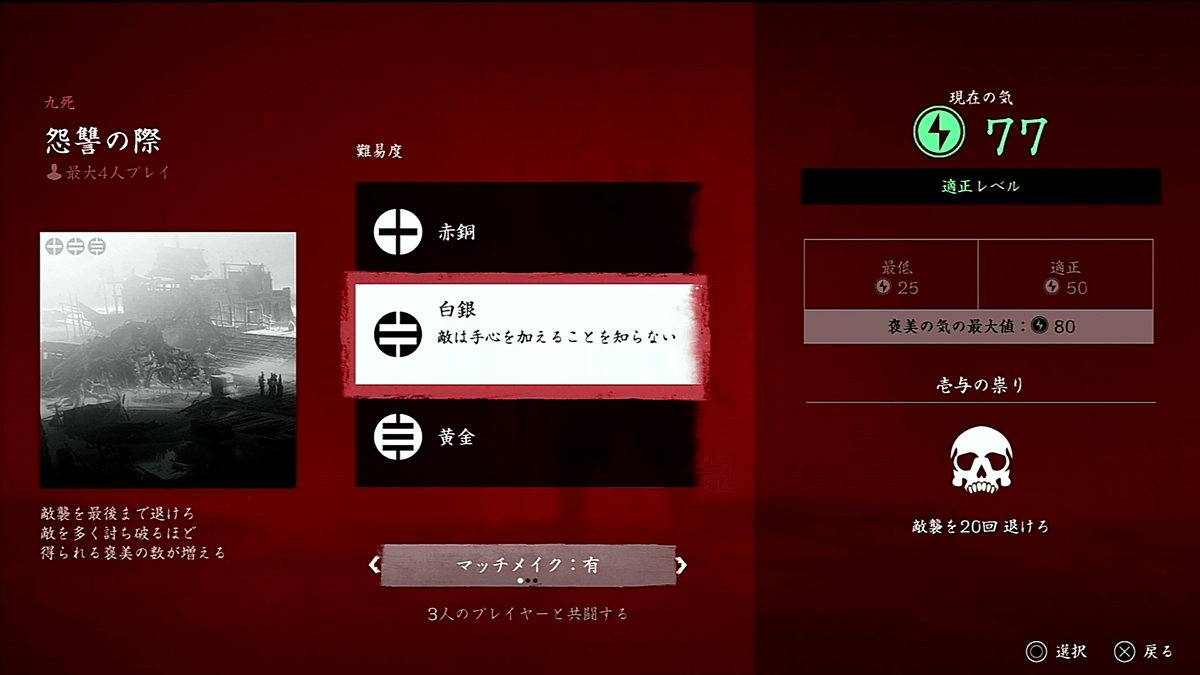 “奇譚”では、最初に選べる赤銅で死亡しても何度でもリトライでき、また失敗しても褒美は減らない。クリアできれば確実に褒美が得られ、強くなれる。白銀以降は全滅に回数制限が設けられているので、アクションが苦手であれば赤銅での基本練習を重ねて挑むのがいいだろう。とはいえ本編と違い、隣には心強い冥人がいるので、マルチプレイのほうがラクに進めるだろう。