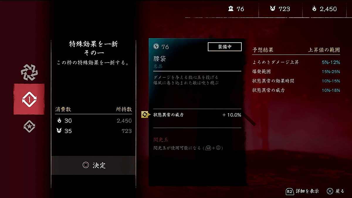 武具が名品以降であれば“恵み”と“意気”と“誉れ”を消費して“改良”ができ、ランダムで特殊効果や技能などを変更できる。例えば回復薬の回復量を上げる特殊効果を狙ったり、炎上の特殊効果を持つくないを用意したりと遊びの幅はかなり広い。