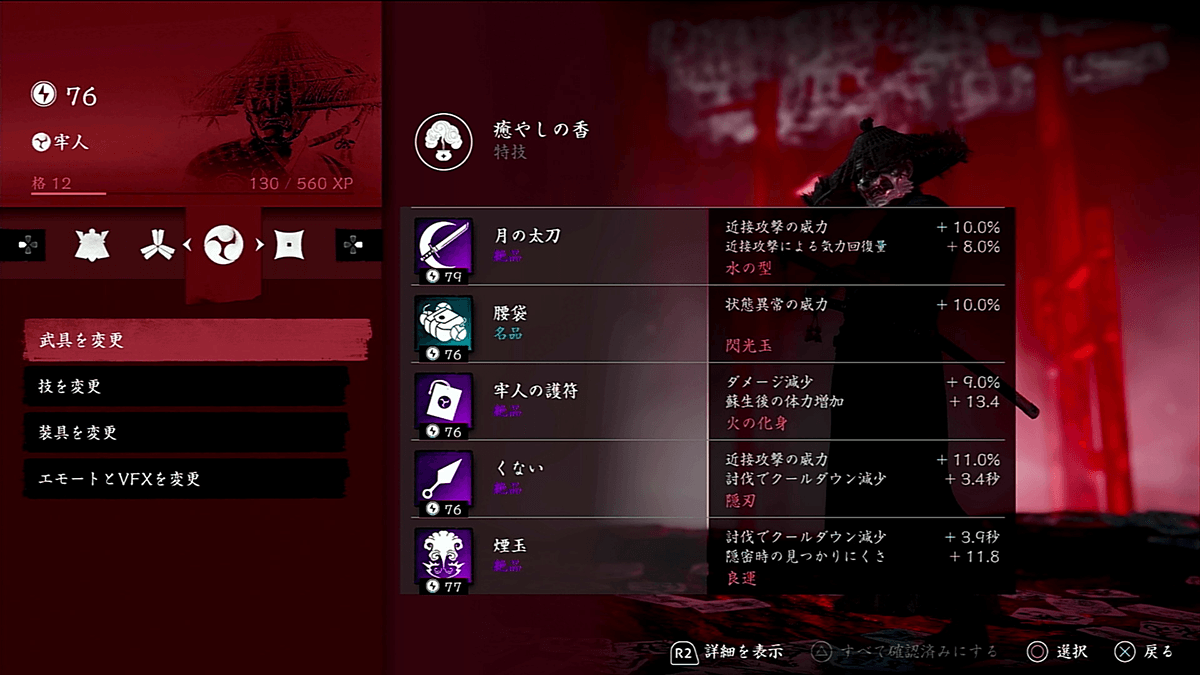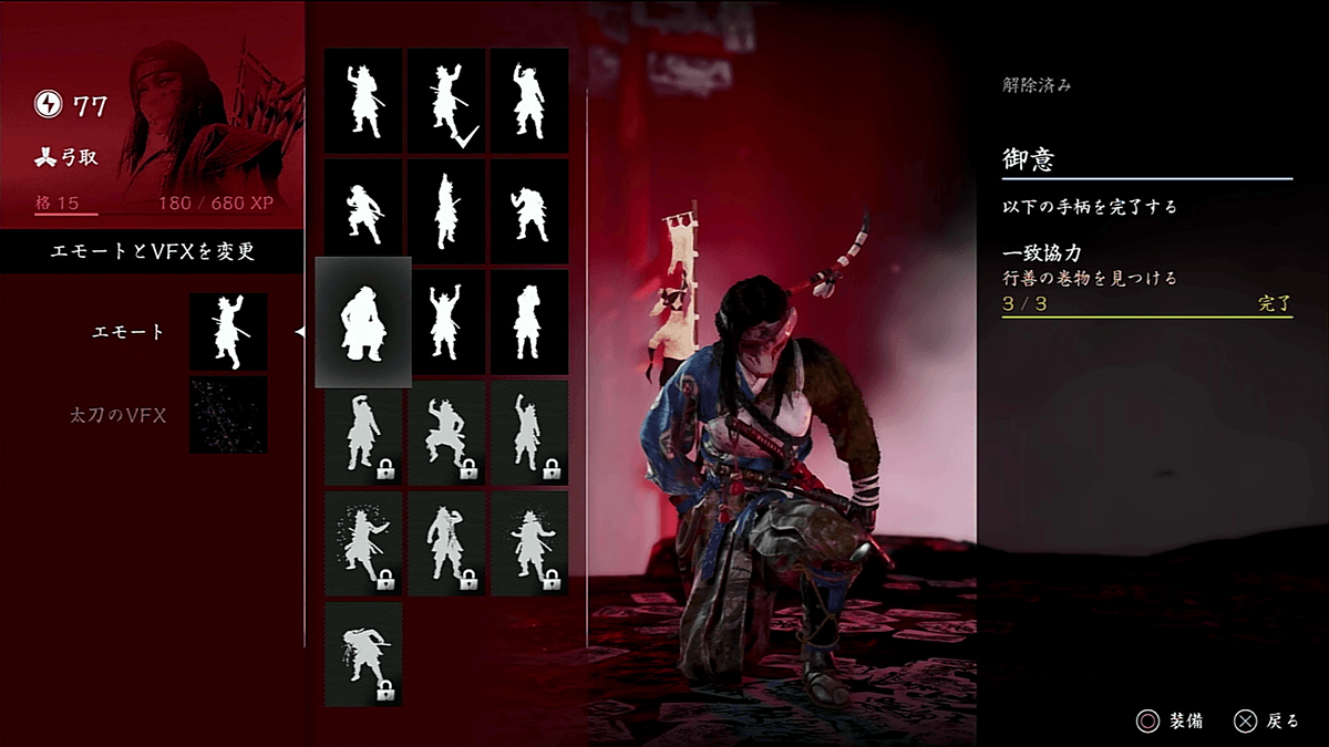 冥人の見た目を変更できる装具は、本編の“仁之道”クリアで得た面頬が反映されている。また、“役目”ごとに異なる特定のアクションや白銀以上の難易度で見つかる“行善の巻物”を集めれば、装具やエモートが入手できるコレクション要素もある。高難易度かつ条件付きのほうが得られる装具は豪華なので、マルチプレイ時には一目置かれること間違いなし!