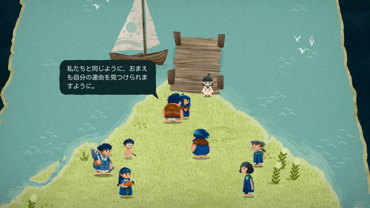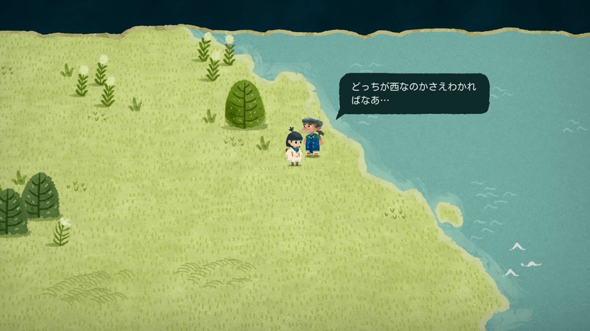 たとえば最初の島には、迷子になっている忘れっぽいおじさんがいる。彼やほかの住民たちの会話には、自然な形でおじさんの家の立地や方角の情報が入っている。そこで改めて全体マップ上で地図の欠片を組み替えて条件を満たしてあげると、おじさんの家が出現し、新たな地図の欠片が手に入るといった具合だ。
