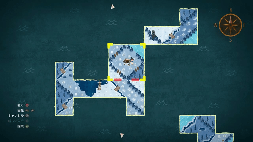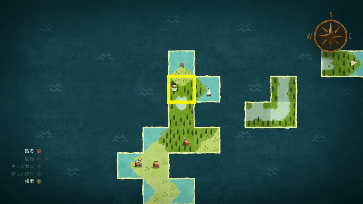 本作のメインの要素といえるのが、全体マップ画面で行なえる地図の欠片の組み換えだ。集めた地図の欠片は、この全体マップ上で自由に移動させたり、左右に回転したりできる。ただし、欠片同士をくっつけて並べる場合は同じ地形が隣り合っていないと配置できないルールで、地図に描かれた道をつなぎたいときなどは、きちんと考えて欠片を配置する必要がある。