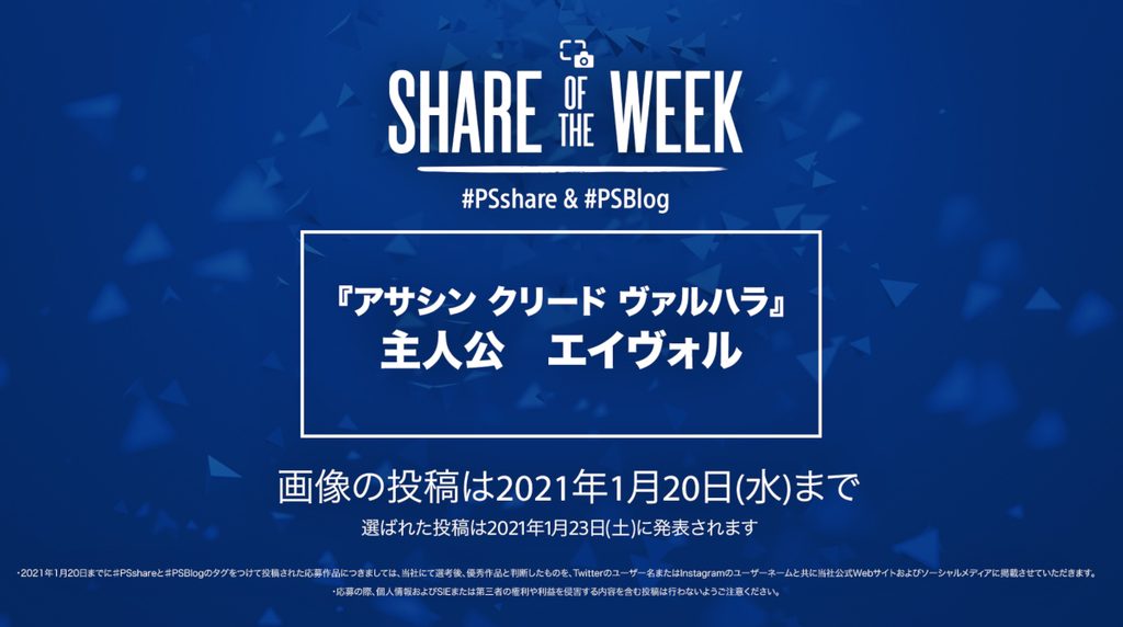 次週はふたたび『アサシン クリード ヴァルハラ』から、主人公「エイヴォル」にフォーカス! ヴァイキングの英雄エイヴォルのさまざまな姿をキャプチャして #PSshareと#PSBlog、ふたつのハッシュタグとともに、1月20日(水)までに投稿してください。あなたの投稿が各国のPS公式メディアから世界中に発信されるチャンスです!