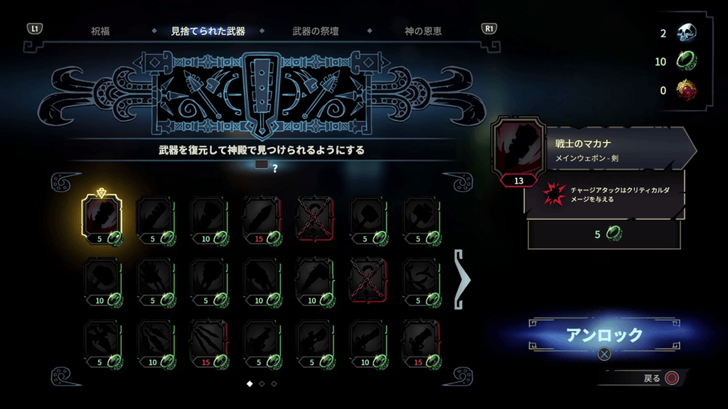 それぞれ、「祝福」はたいまつやかがり火の光を受けているときに受けるダメージを減らすなど、冒険を助ける能力を最大3つまで装備できるもの。「見捨てられた武器」はダンジョン内の祭壇で手に入る武器の種類を増やし、「武器の祭壇」はスタート時に選べる武器を増やすもの。最後の「神の恩恵」は、ダンジョン内の祭壇で入手できる武器、遺物、強化できる属性の候補を変更できる。