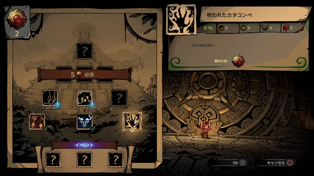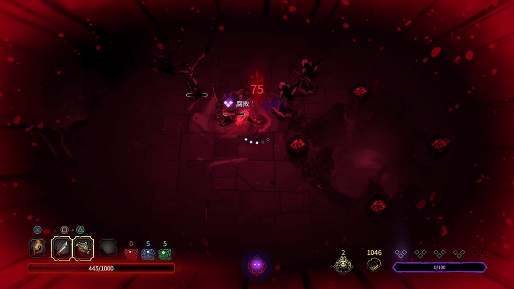 4回まで呪われてもOKというと余裕がありそうだが、ダンジョン内の祭壇では、ゴールドが足りずほしいものを手に入れるために血液を捧げ、腐敗ゲージを使う状況がかなりの頻度で発生する。中ボスが出現するダンジョンではそれを倒すことで呪いがひとつ解除されるが、それ以外に大きくゲージを減らす方法はなく、厳しい戦いの中で腐敗ゲージに余裕を作れるかどうかはプレイヤーの腕しだいだ。