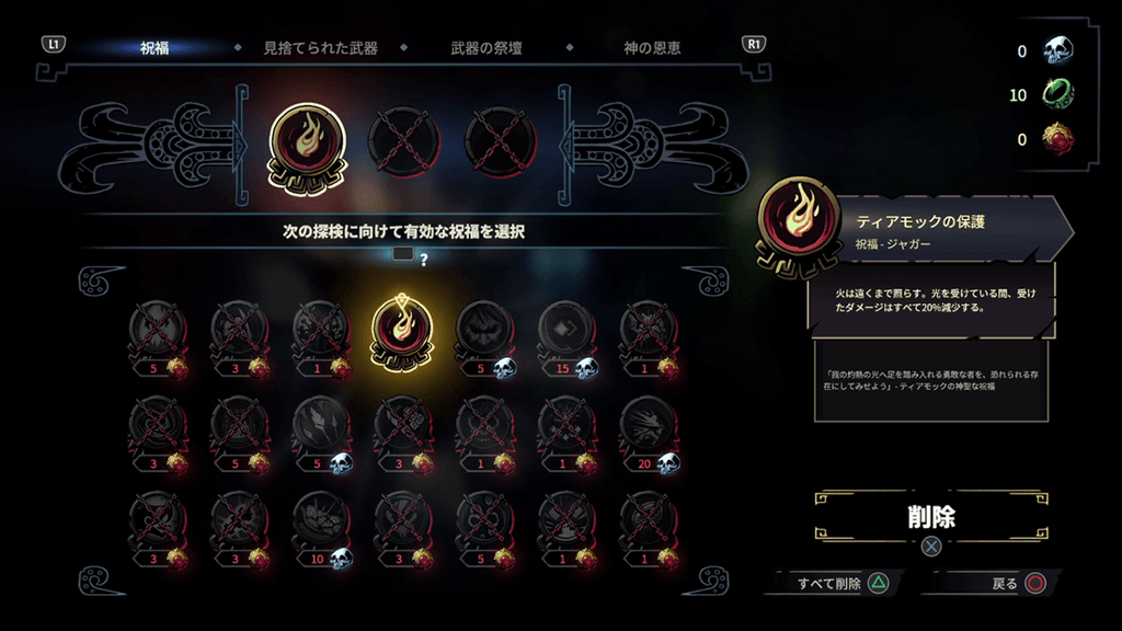 それぞれの入手に必要な水晶の頭蓋骨や指輪は、武器などとは違ってダンジョンの探索中に倒れたときでも持ち帰れるので、繰り返し挑戦すれば最後はすべての要素を利用可能にできる。なかなか先に進めないダンジョンが、祝福の組み合わせを見直すことで意外なほど攻略しやすくなる場合もあるので、何度も挑戦して選べる祝福を増やしておくといいだろう。