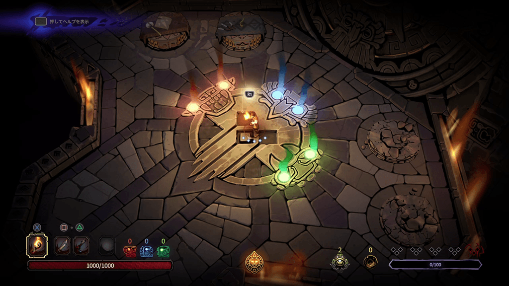 冒険の舞台となる古代の寺院は、入るたびに構造が変わる自動生成タイプのダンジョン。デザインは南米のアステカやマヤといった文明がモチーフになっており、不気味な仮面のような装飾と闇に包まれたダークな雰囲気にあふれている。