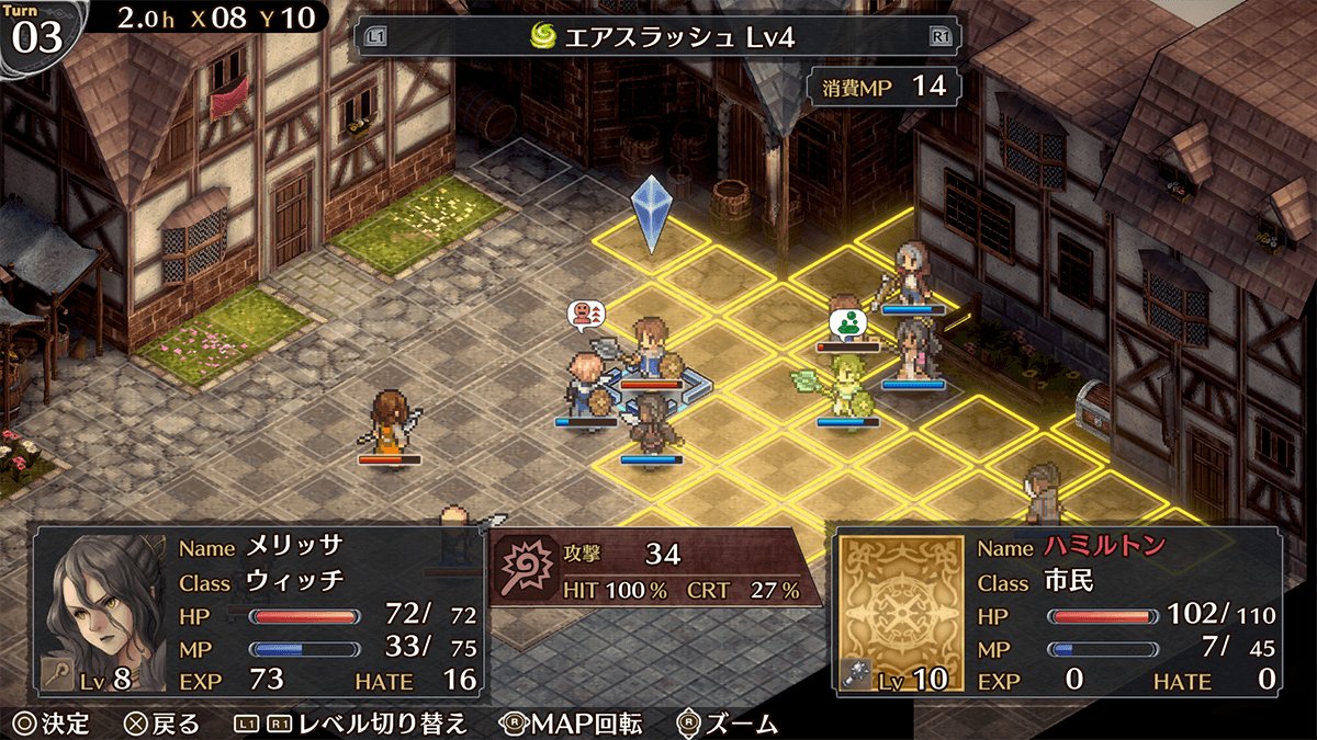 戦闘は、高低差のあるクォータービューのマップで行なわれる。近接攻撃が得意なファイター、遠距離攻撃が得意なガンナー、味方の回復や支援を担当するプリーストなど、さまざまな役割を持つキャラクターを操作して戦いを繰り広げよう。正面・背後・横方向で結果が変わったり、味方キャラの立ち位置によって援護効果が発生したりする戦略性の高さが魅力となっている。