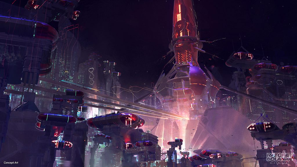別次元のコルソンVにある「ネファリウスシティ」は、サイバーパンク的なディストピア。ドクター・ネファリウスが惑星を作り変えてしまった。これまでサイバーパンクな表現は「ラチェット&クランク」のイメージに合わないため使ってこなかったが、少しひねりを加えて世界観に合うようにした。敵ロボットは1950年代のSFに出てくるようなレトロなデザインで、ダンスクラブでは暗い曲に合わせてノリノリで踊っているなど、ディストピアだが、面白いところもある都市だ。