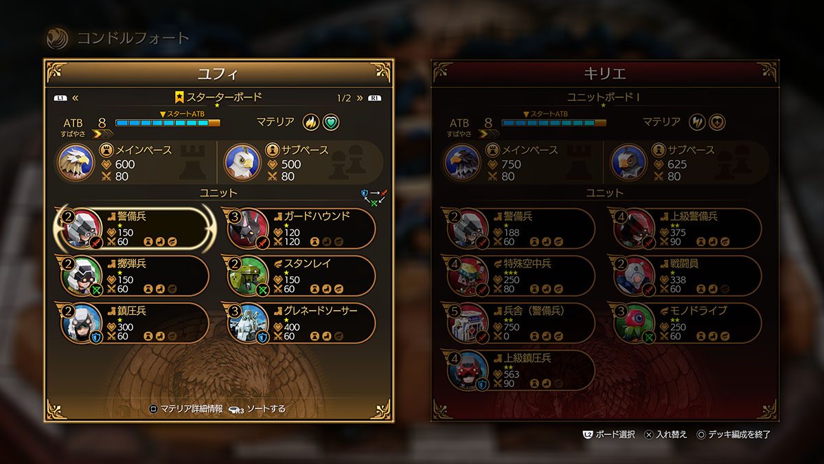 始めにデッキ編成で「ボード」と、配置する駒である「ユニット」の編成を変更することができる。ボードにより、マテリアやATBゲージの増加量が左右される。