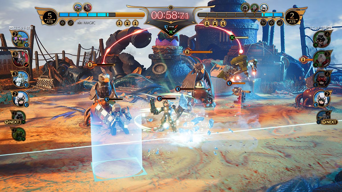ATBゲージを消費して、フィールドにユニットを配置。配置されたユニットは自動的に敵に向かい進軍し、敵軍のユニットとぶつかると自動で戦闘を行なう。