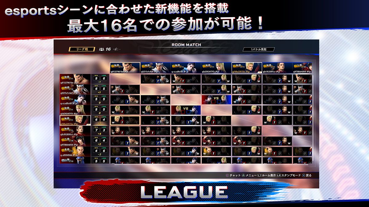「ランクマッチ」「アーケード」「トレーニング」「オフラインバーサス」といった従来のモードに加え、ダブルイリミネーションルールに対応した最大16名の参加が可能な「トーナメント戦」、総当たり戦の「リーグ戦」など、esportsシーンに合わせた多彩な新機能を搭載!