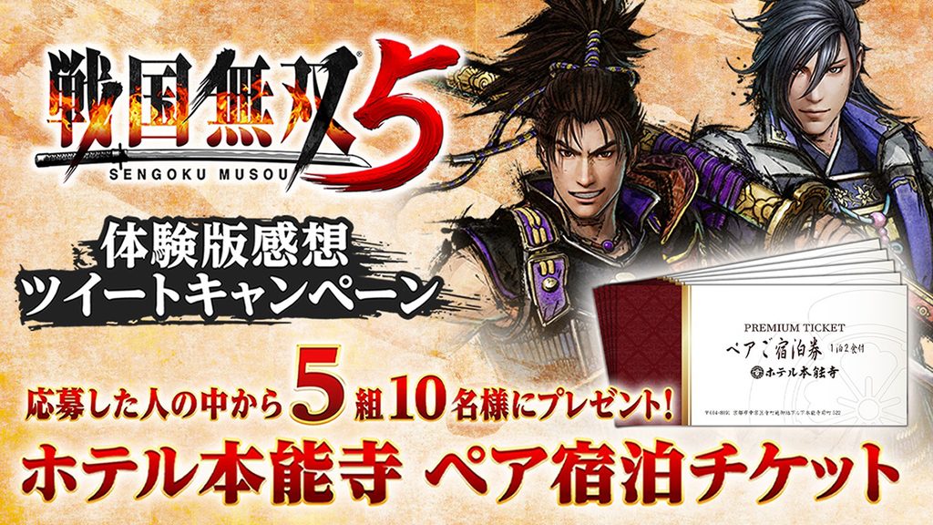 「戦国無双」公式Twitterにて6月17日(木)から発売日前日の6月23日(水)23:59まで「体験版感想ツイートキャンペーン」を開催! 『戦国無双5』の体験版を遊び、指定のハッシュタグをつけて感想をツイートいただいた方の中から、5組10名様にホテル本能寺ペア宿泊チケットをプレゼント!