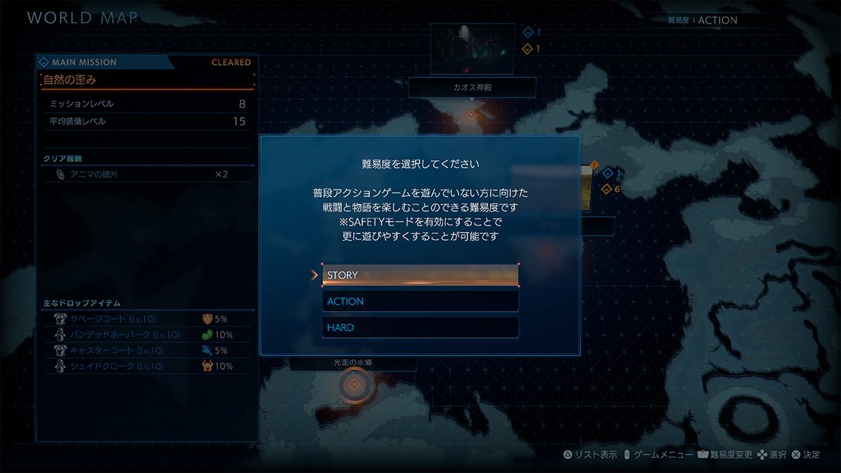 普段アクションゲームを遊んでいない方に向けた、戦闘と物語を楽しめる難易度。SAFETYモードを有効にすることで、さらに遊びやすくすることが可能。