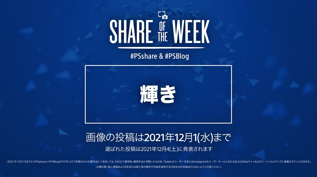 次週のテーマは「輝き」! まばゆい陽光や黄金の宝物など、お気に入りのゲームの世界で輝くものをキャプチャ! #PSshareと#PSBlog、ふたつのハッシュタグとともに、12月1日(水)までに投稿してください。あなたの投稿が各国のPS公式メディアから世界中に発信されるチャンスです!