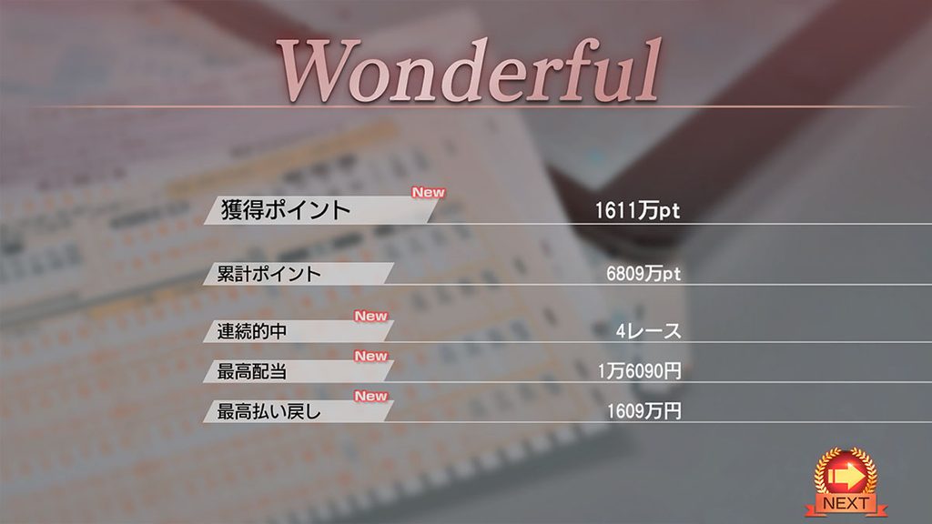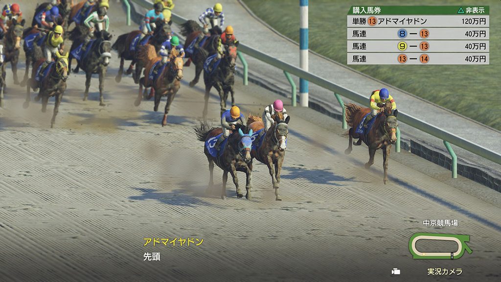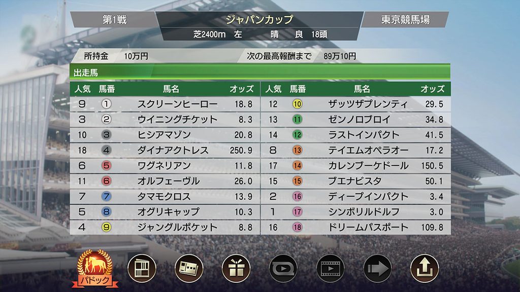 馬券は単勝、複勝、馬連、枠連、ワイド、馬単、3連複、3連単の8種類が購入可能。最初に秘書からプレゼントされた所持金を資金配分し、馬券を購入していく。