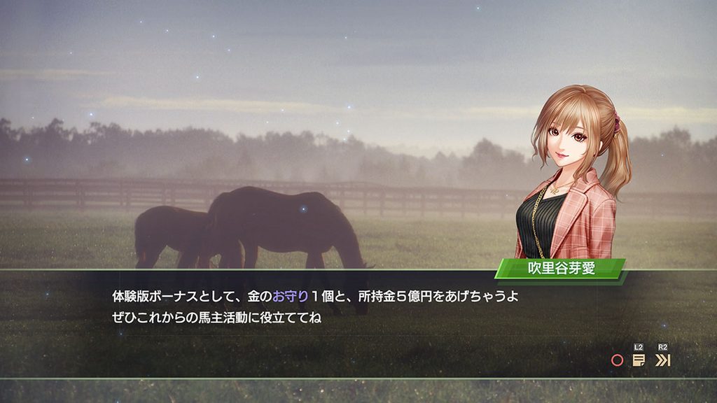 体験版をプレイすると、ゲーム開始1年目の1月1週に「金のお守り」1個と所持金5億円をボーナスとして獲得できる。「金のお守り」は史実馬の入手に必要な重要アイテムなので、ぜひ体験版をプレイしてゲットしておこう! 配信日は後日公開されるとのことなので、公式サイトや公式Twitterなどを要チェックだ。