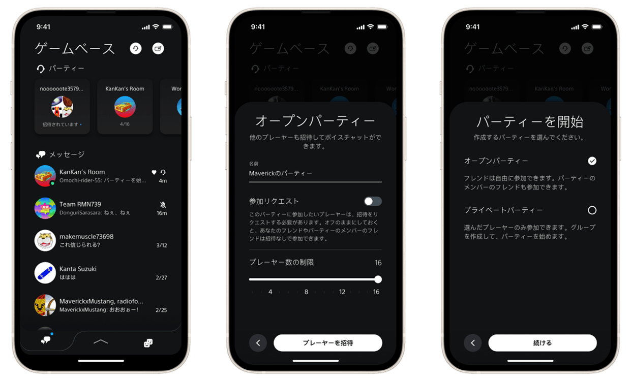明日3月24日より、PS Appからオープンパーティーおよびプライベートパーティーを作成し、パーティーに参加できる機能を順次実装いたします。またPS AppのゲームベースのUIを刷新し、PS5と同様にフレンド機能、パーティー機能、メッセージ機能へ簡単にアクセスできるようになりました。