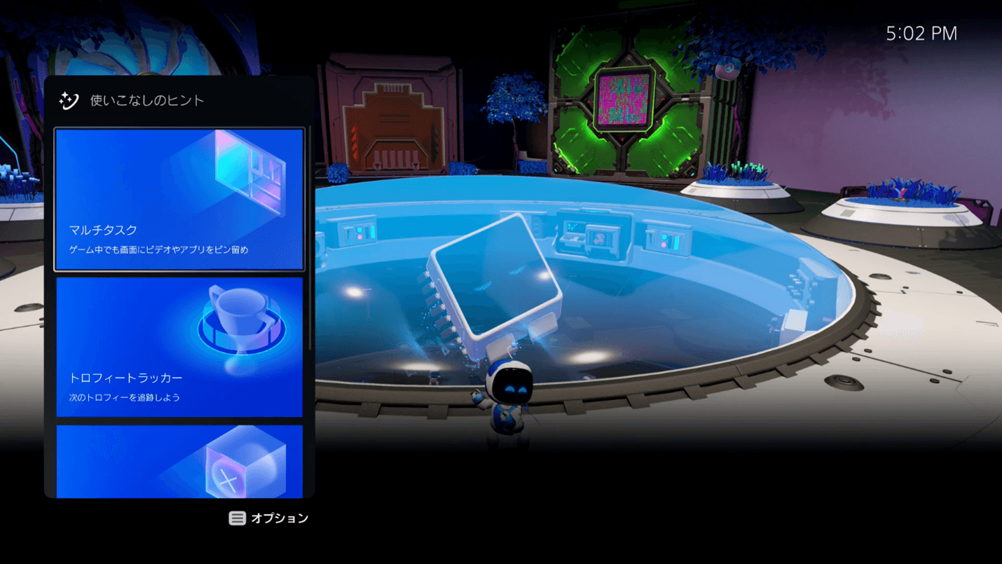 コントロールセンターに新しく追加する「使いこなしのヒント」のカードをご覧いただくと、PS5でゲームプリセットを設定する方法や、ゲーム中にビデオやアプリを画面にピン留めする方法、フレンドにゲーム画面をシェアする方法など、PS5の機能を活用するためのヒントをご確認いただけます。