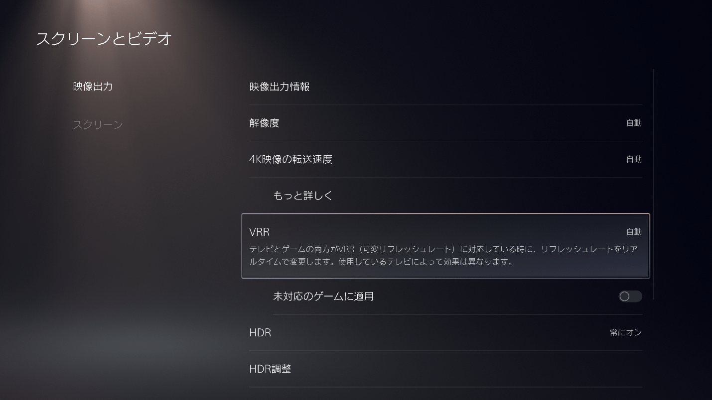 さらに追加オプションとして、VRRに対応していないPS5のタイトルにもVRRを適用することが可能です。この機能により、一部のゲームでは映像品質が向上する場合があります。もしVRRを適用したことで予期しない視覚効果が生じた際には、いつでもこのオプションを無効にすることができます。VRRおよび上記の追加オプションは、どちらもオン/オフの切り替えが可能です。