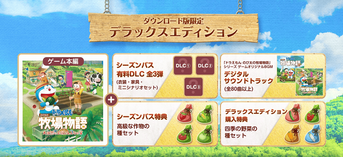 作物を育てる、動物のお世話など「牧場物語」シリーズならではの遊びはもちろん、「ドラえもん」らしいひみつ道具を用いた楽しい遊びが盛りだくさん! 今作からの新しい遊びや要素もたくさん加わり、完全新作の心温まるストーリーが展開する。のび太たちと新しい牧場生活を始めてみよう。