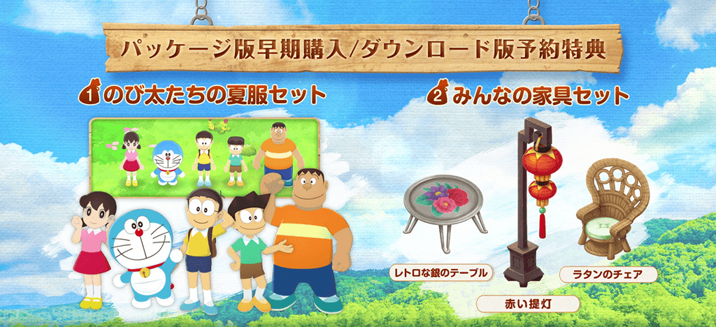※「のび太たちの夏服セット」は【はるの月4日】掲示板チュートリアル終了後、本特典に関する「やることメモ」達成条件をクリアすることで入手できます。衣装のイラストを入手後、ゲーム内の自宅地下に置かれる「きせかえカメラ」を調べることで着替えられるようになります。