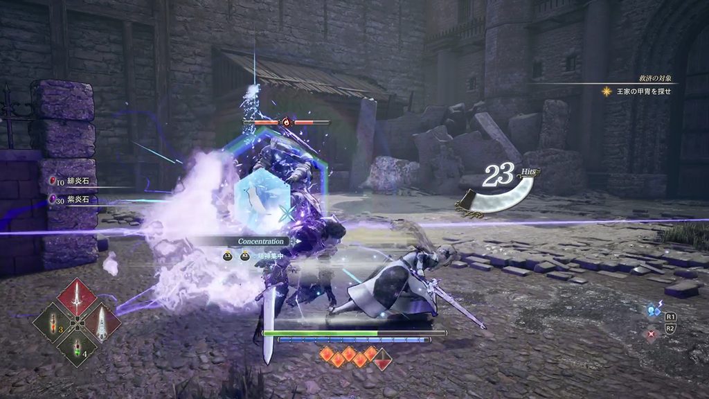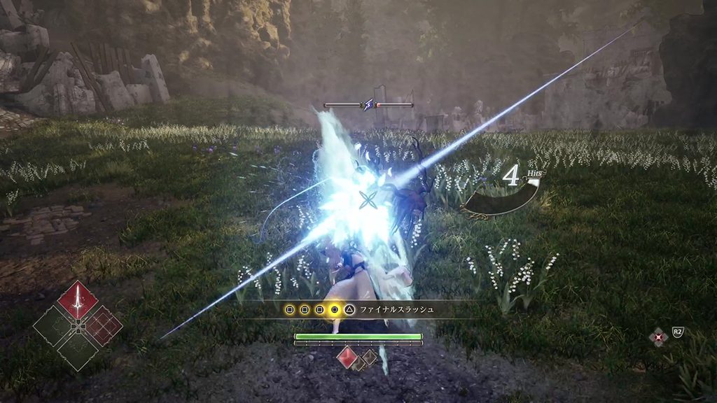 戦闘の基本になるのが武器を使ったコンボ攻撃。□ボタンの通常攻撃と△ボタンの変化攻撃を組み合わせ、さまざまな連撃を簡単に繰り出せる。武器を強化すると攻撃力がアップするほか、コンボやアクションの新たなバリエーションも解放されていく。