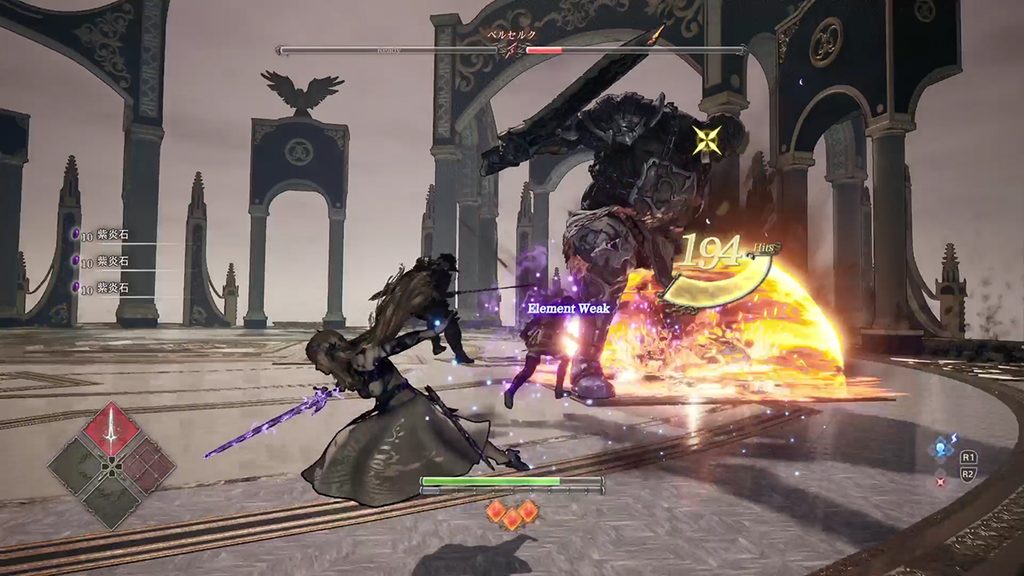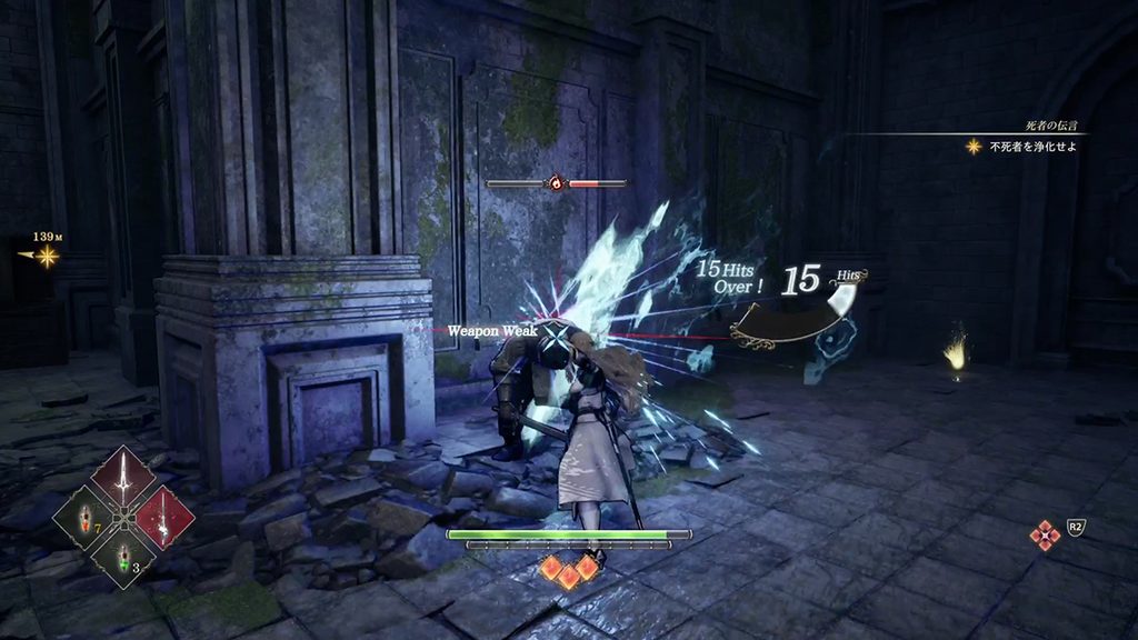 ストーリーを進めると新たな武器を入手でき、最大ふたつの武器を装備パレットにセットし、切り替えながら戦うことが可能。剣、レイピア、槍、双刃槍といった種類があり、それぞれ攻撃モーションが異なるのはもちろん、武器種としての属性を持っている。攻撃した際に「Weapon Weak」と表示されたら、使っている武器種が対象の敵の弱点属性だ。