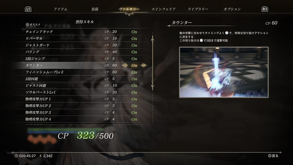 各スキルにはCPというコストが設定されており、ヴァルキリー自身の総CPを超えて設定することはできない。序盤こそ習得したスキルはすべて有効にできるが、CPの上限に近づいてきたら取捨選択が必要。例えば、回避に自信があるなら、被ダメージ減少やガード系のスキルを無効にして火力アップに振るなど、プレイヤーのスタイルに合わせたヴァルキリーにカスタマイズしていけるというわけだ。