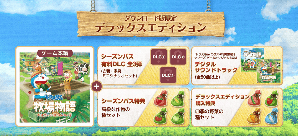 ダウンロード版限定の『デラックスエディション』は、全3弾の有料DLCを入手できるシーズンパスや、ゲーム内BGMを80曲以上収録するデジタルサウンドトラックが付属する。また、シーズンパス購入特典の「高級な作物の種セット」と、デラックスエディション購入特典の「四季の野菜の種セット」も入手可能!
