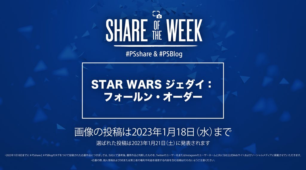 次週のテーマは『STAR WARS ジェダイ:フォールン・オーダー』! PlayStation®Plusのフリープレイで配信中! 仲間と共に宇宙を旅するなか、お気に入りの瞬間をキャプチャして#PSshareと#PSBlog、ふたつのハッシュタグとともに、1月18日(水)までに投稿してください。あなたの投稿が各国のPS公式メディアから世界中に発信されるチャンスです!