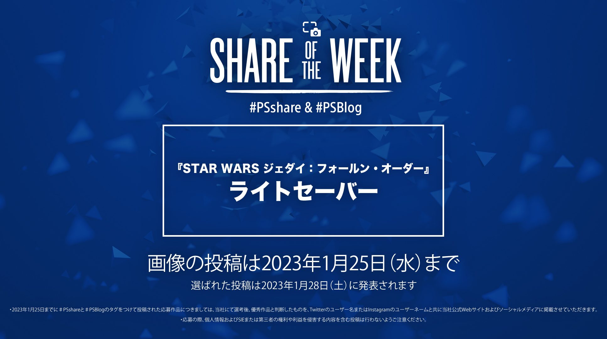 次週のテーマは『STAR WARS ジェダイ:フォールン・オーダー』のライトセーバー! 自分好みにカスタマイズ可能! ライトセーバーをメインに、お気に入りの瞬間をキャプチャして#PSshareと#PSBlog、ふたつのハッシュタグとともに、1月25日(水)までに投稿してください。あなたの投稿が各国のPS公式メディアから世界中に発信されるチャンスです!