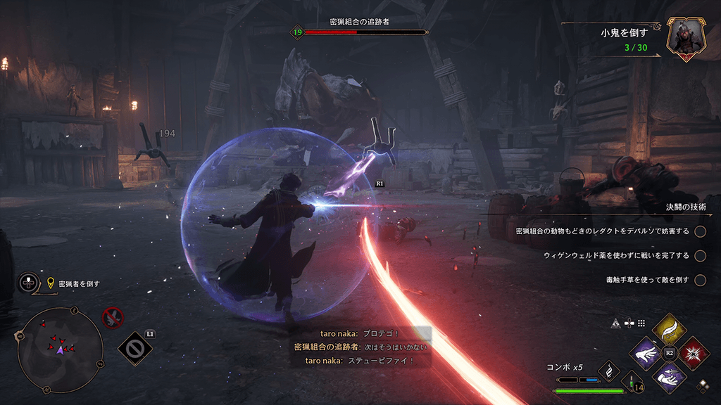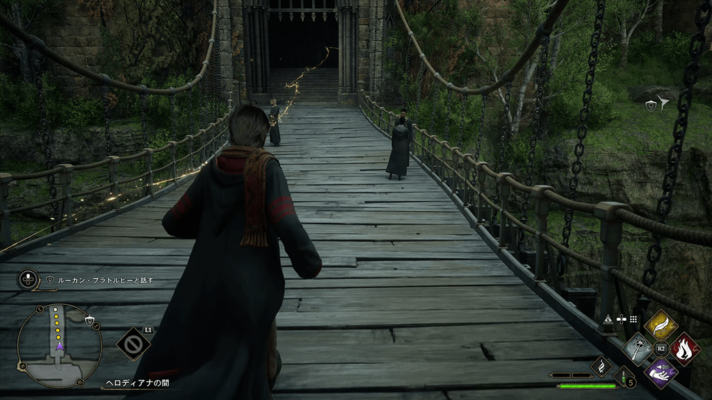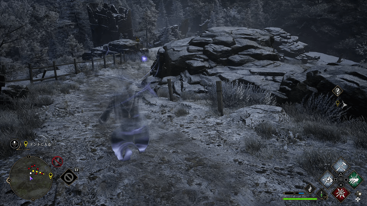 続いて体験したのは、友人の生徒ポピー・スウィーティングとともにするクエスト。魔法生物を捕獲しているという密猟者たちの同行を探るため、森の中に入っていく。目的地までの道中には密猟者の見張りが複数いて、これを突破しなければならない。正面から突撃してもいいが、ここでは「目くらまし術」を使ってみた。自分の姿を透過させて見つかりにくくし、こっそり近づいてから奇襲をかける作戦だ。攻撃が目的ではない呪文でも、ステルス的な戦略で活用することができる。