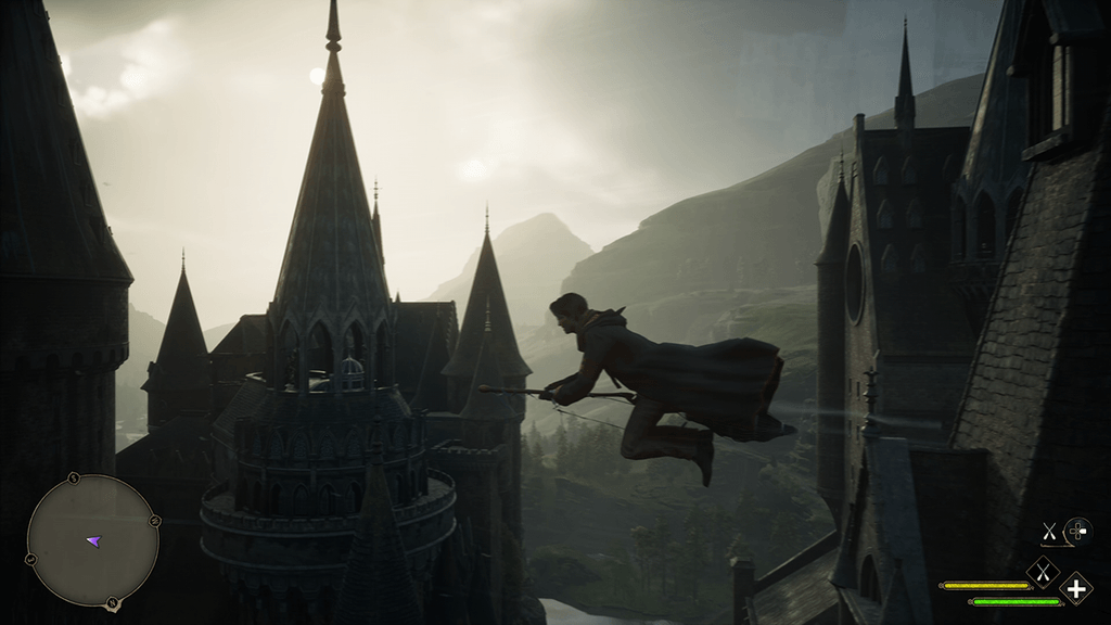 そして、箒に乗って空を飛ぶこともできる。高度を上げれば城の周りに広がる世界が見えるし、城壁や地面スレスレを飛んでスピード感を味わうのも気持ちいい。今回のプレイでは体験できなかったが、箒でレースをする要素もあるとのことで、このスピードと浮遊感で競い合うのは間違いなく楽しそうだ。