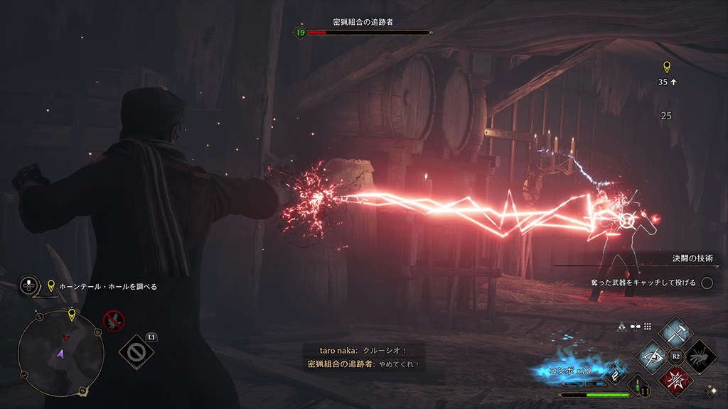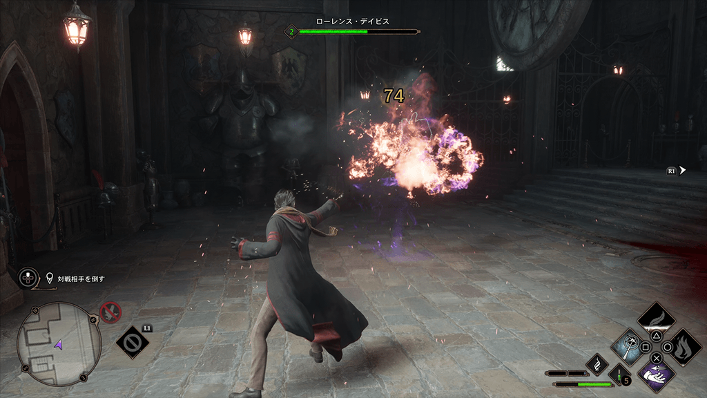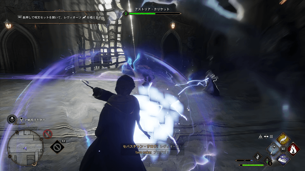 杖十字会のデビュー戦は2対2のタッグマッチ。友人であるセバスチャン・サロウとともに、相手ペアを倒せば勝利だ。魔法バトルではR2ボタンで基本攻撃となる魔法の射撃を放つほか、ボタンの組み合わせ操作で炎の呪文「インセンディオ」や浮遊魔法「レヴィオーソ」なども使える。「レヴィオーソ」は相手を浮かせる呪文だが、相手が展開している盾を消し、動きを封じることが可能。呪文の特性を理解して活かすことが、魔法バトルのポイントになるようだ。