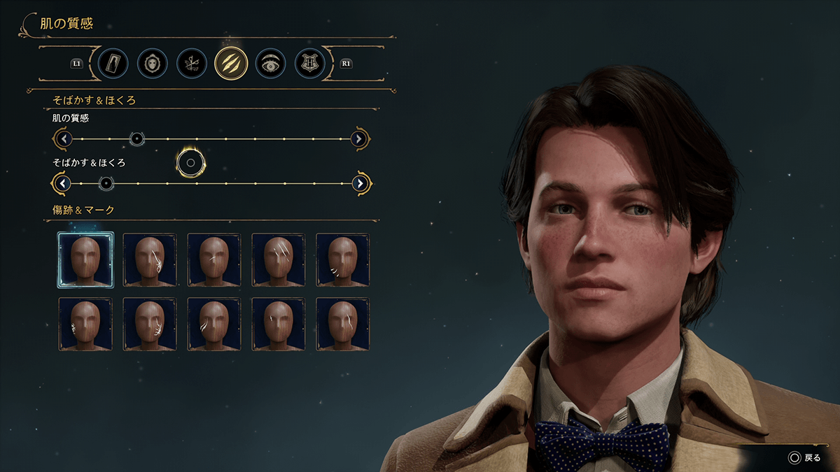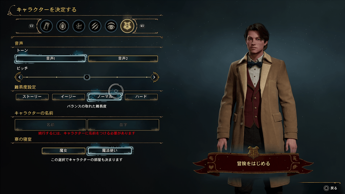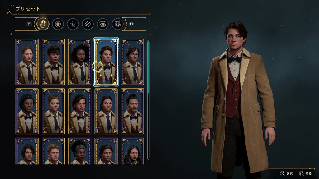 まずはキャラクタークリエイトからスタート。さまざまなパターンのプリセットから選べるほか、顔、髪型、肌の質感、目の色や眉毛などを細かく調整できる。ここで作成した主人公キャラクターで魔法界を冒険するのだから、気合を入れて納得するまで作り込みたいところだが、今回は時間が限られているのでプリセットから選ぶことにした。