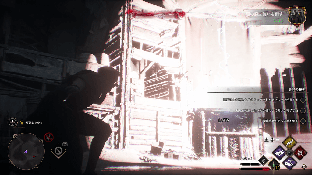 密猟組合の動物もどきが率いる集団とのバトルは、これまでよりもさらに激しいものとなった。敵の数が多いため、死角からも容赦なく攻撃が飛んでくるし、「レヴィオーソ」で動きを封じられることもある。しかし、杖十字会の決闘のときとは違い、このクエストではこちらも使える呪文が増えている。敵の武器を奪う呪文「エクスペリアームス」や爆発する呪文「コンフリンゴ」、敵の呪文を妨害する「デパルソ」、そして闇の魔術のひとつ「クルーシオ」も!? 呪文の操作パレットを切り替えることで8種類の呪文を使い分けが可能で、慣れてくれば自由で多彩な戦闘スタイルを構築できるだろう。また、特定の条件下では超強力な古代魔術まで放つことができた。