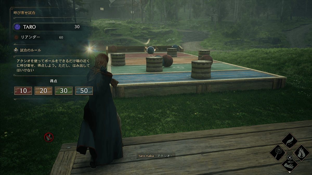 中庭でひとりの生徒に話しかけると、「呼び寄せ試合」の対戦を申し込まれた。「呼び寄せ試合」とは、物体を引き寄せる呪文「アクシオ」を使ってボールを呼び寄せ、止まった位置に応じた得点を競うゲーム。なるべく手前近くまで呼び寄せ、それでいて盤面から落としてはならない。また、相手のボールを弾いて動かすこともできる。呼び寄せるコースと強さの加減が意外と難しく、本気になったら時間を忘れてのめり込んでしまいそうだ。