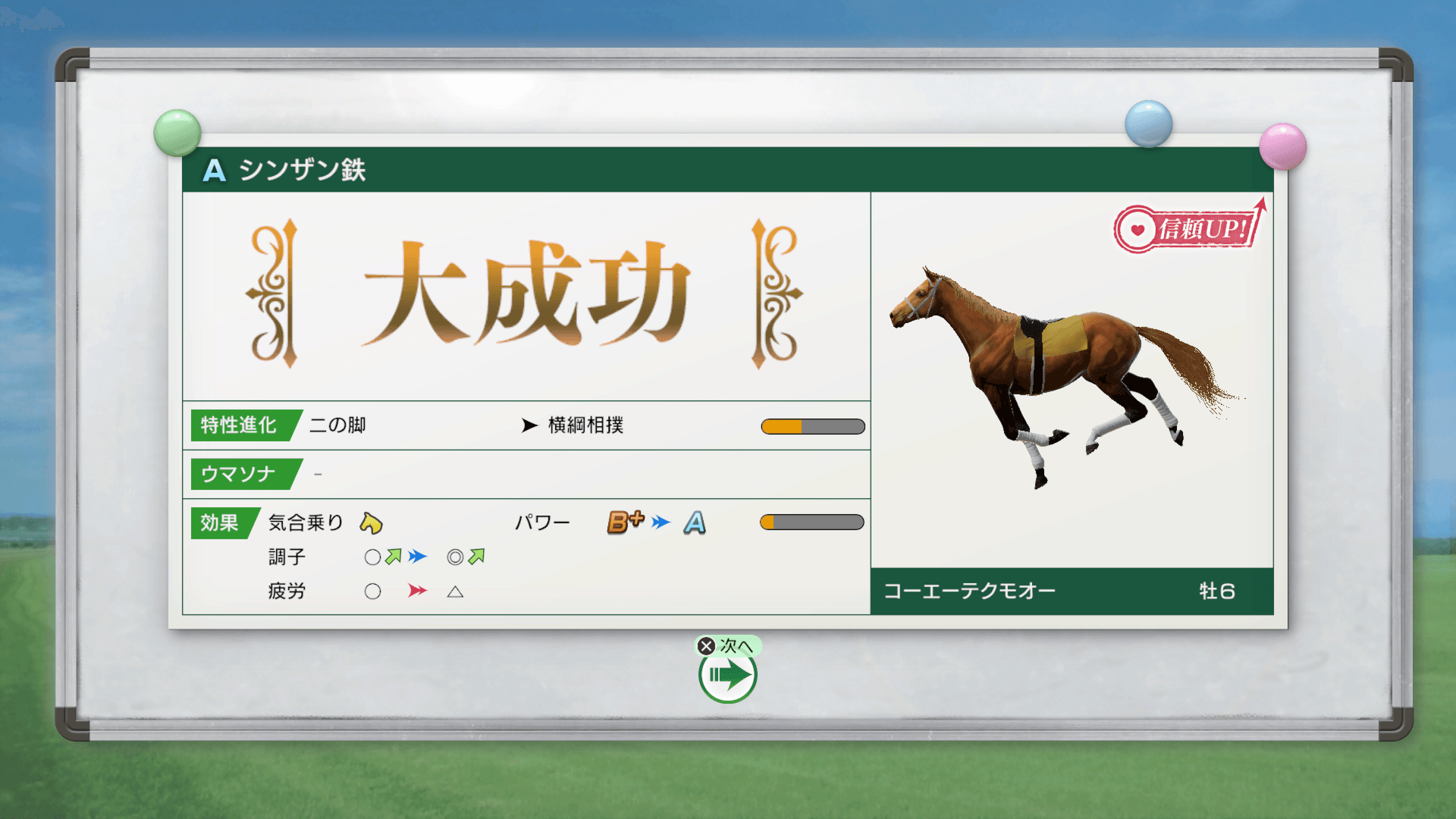 また、史実調教は、ときに大成功することもあります。大成功すると、通常よりも大きな効果が得られるだけでなく、競走馬の信頼度が向上したり、特性が上位の特性に進化したりします。競走馬のウマーソナリティや血統などに応じて大成功する確率は変化するため、“どの効果が得られるか”だけでなく、“どれだけ大成功しやすいか”も考慮しながら史実調教を選ぶことも重要となります。