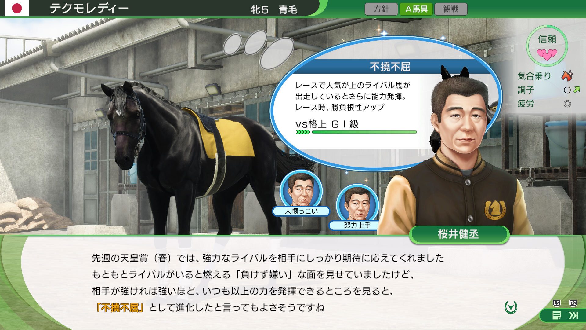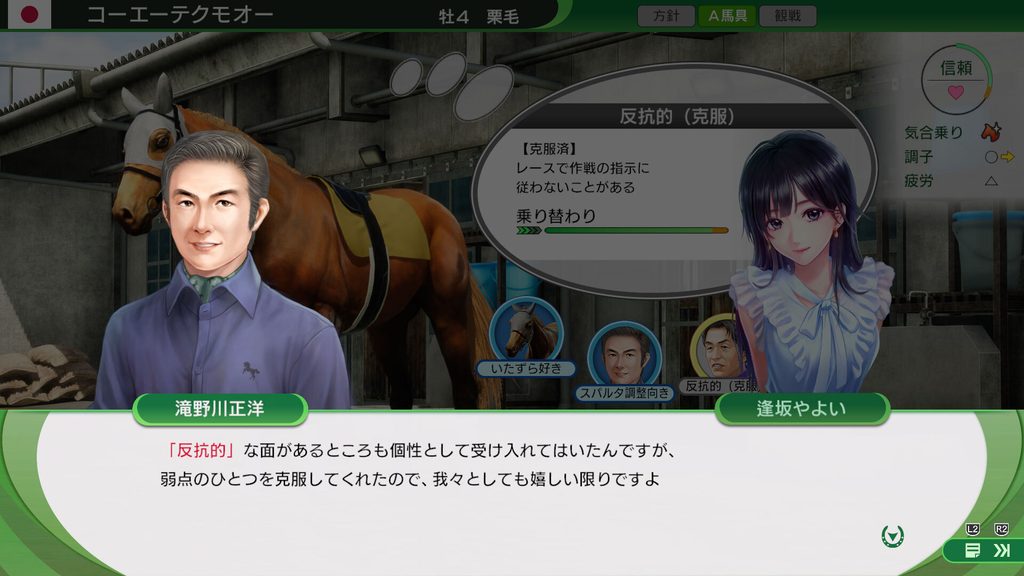 たとえば、ウマーソナリティ“反抗的”はレースで騎手の指示に従わないことがあるマイナスの個性ですが、信頼度を上げて克服すると反抗的な面は抑えられ、レースで指示に従うようになります。