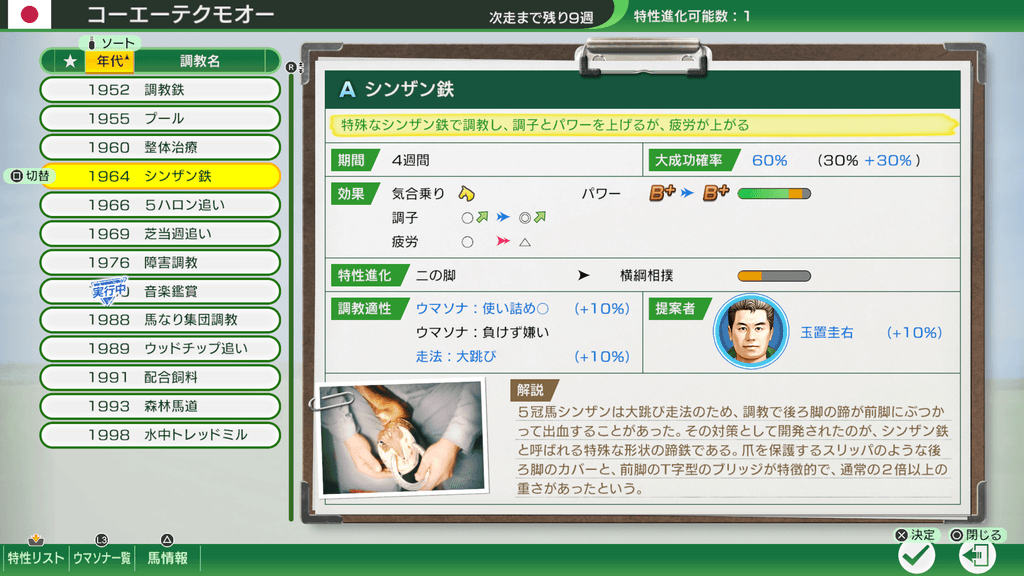 日本競馬に大きな影響を与えた調教技術を再現した史実調教は、“シンザン鉄”や“芝当週追い”など30種類以上あります。史実調教はさまざまな効果を発揮し、たとえばシンザン鉄は競走馬の調子とパワーを上げる一方、疲労も大きく上がるハイリスク・ハイリターンな調教です。