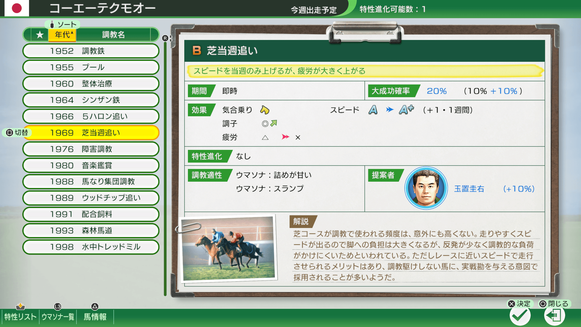 実行すると即時に効果を発揮する芝当週追いなどの調教は、1週間経つと効果が失われてしまいますが、スピードアップや距離適性の延長など、普通の史実調教では得られない特別な効果を持っています。1カ月に実行できる史実調教の数には限りがあるため、シンザン鉄など永続的に馬を鍛えられる調教を優先するか、レースがある週まで即時効果のある調教を温存するかなど、プレイヤーの選択により、競走馬の育成方法が大きく変化します。