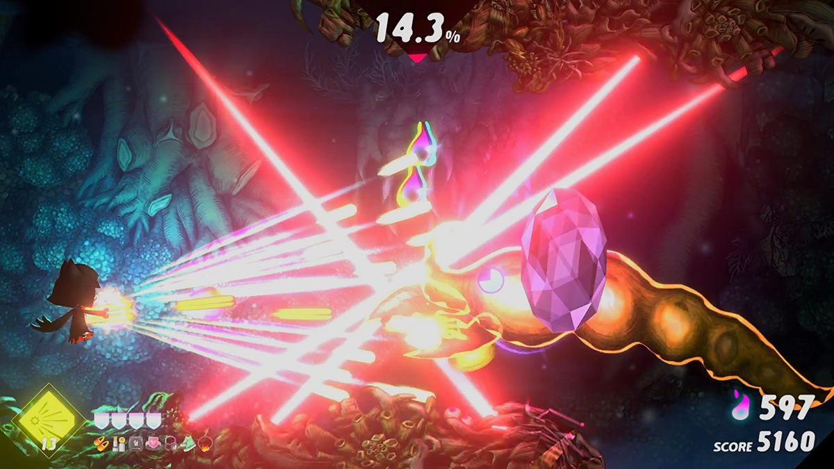本作は左アナログスティックで自機を移動させ、右アナログスティックを倒した方向に弾を撃つという、いわゆるツインスティックシューター。あらゆる方向から迫り来る敵を狙い撃って撃退できる。一見すると横スクロールのシューティングゲームのようだが、縦横はもちろん斜めなど、さまざまな方向にスクロールするステージが舞台となる。