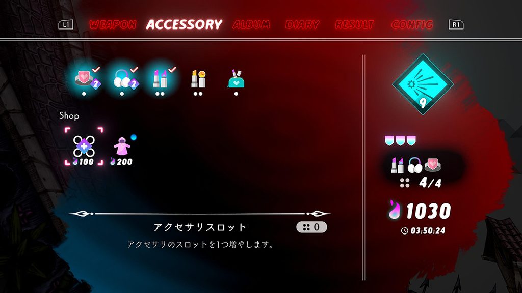 ゲームを進めていくと先に紹介した強力な武器に加えて、自機を強化してくれる「アクセサリ」がショップに登場する。自機の耐久力アップやダメージを受けた際の無敵時間延長、武器の弾数増加など、購入できるアクセサリの効果はさまざまで、ステージ攻略を手助けしてくれる。ただし、アクセサリにはそれぞれコストが設定されており、自機の空きスロットの数しか装備できないのが悩みどころ。スロットの数を増やすアクセサリは優先して購入したい。