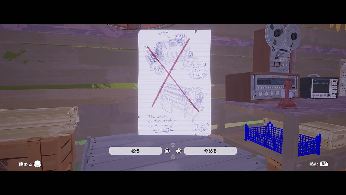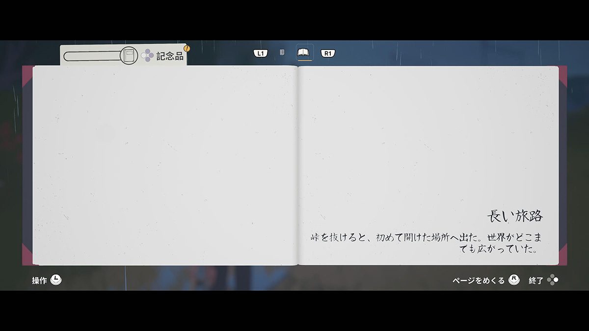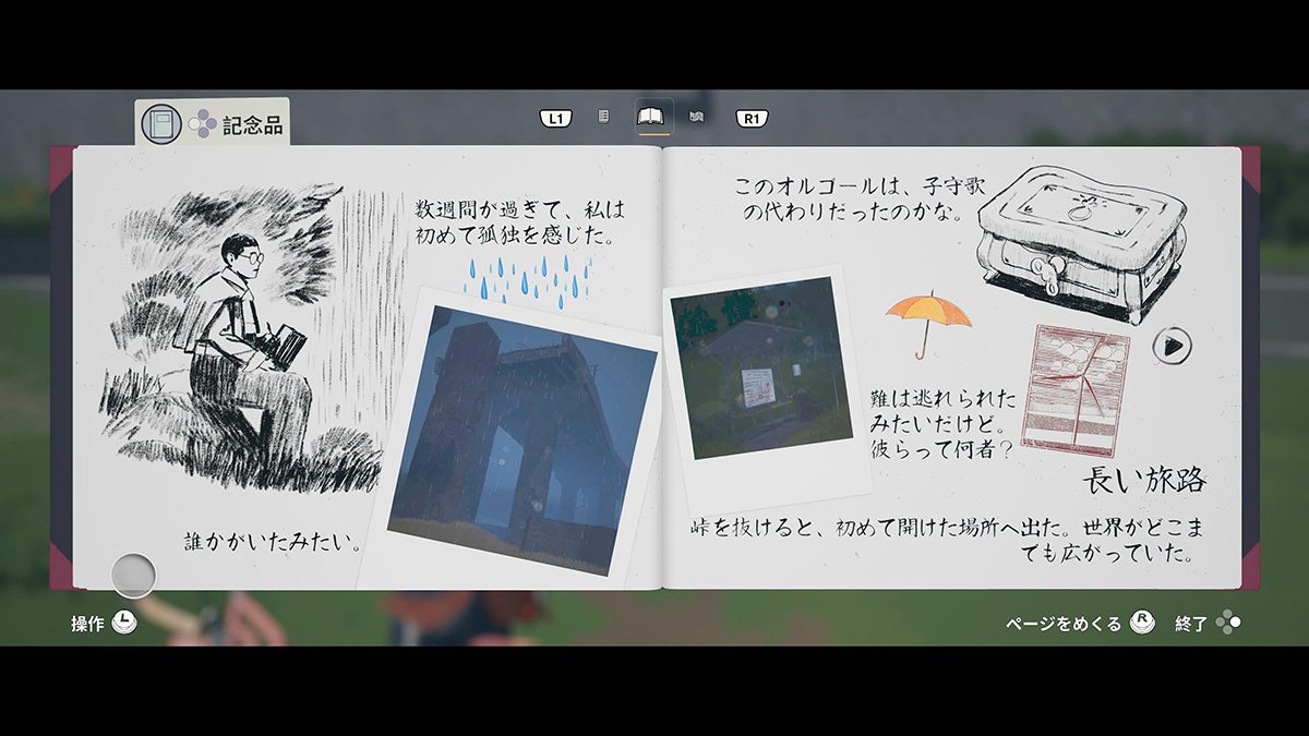 旅の道中では写真や手紙、チラシなどを発見することもあるので、見かけたら拾っておこう。そうしたアイテムや撮影した写真、録音したテープなどの品々は、日記の作成時に使用できる。