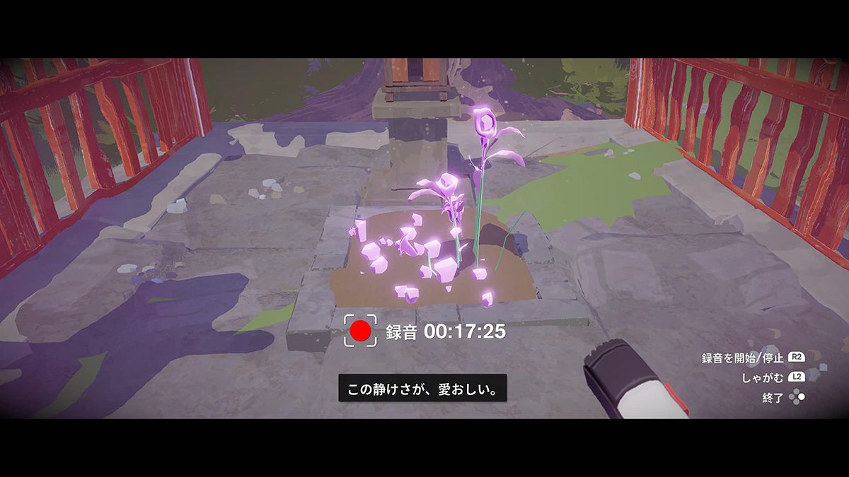 先に紹介したように本作には美しい景色が多数登場するうえに、文明や歴史を感じさせる痕跡に満ちあふれているため、写真撮影には事欠かない。また、この世界には”記憶の花”というものがあり、レコーダーを向けるとかつてそこにいた住人たちの声を録音できるようになっている。
