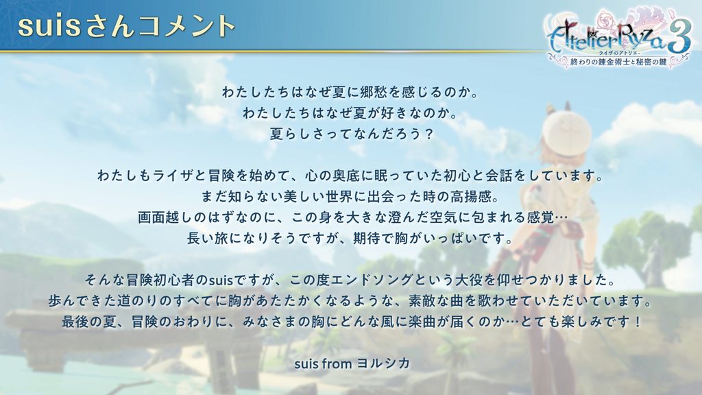 本作のエンディングテーマ「Travelers」を歌唱するのは、バンド「ヨルシカ」のボーカルとしても活躍するsuis(スイ)さん! 今回suisさんからのコメントも公開されました。