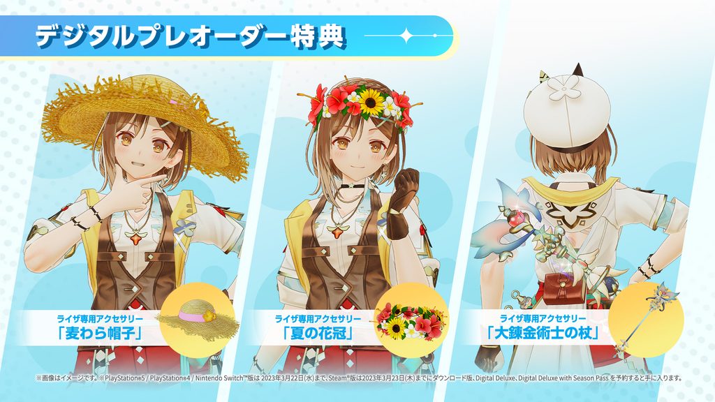 3月22日(水)までに予約すると、デジタルプレオーダー特典として、コスチュームとは別に装備できるライザ専用アクセサリー「麦わら帽子」「夏の花冠」「大錬金術士の杖」が手に入ります。