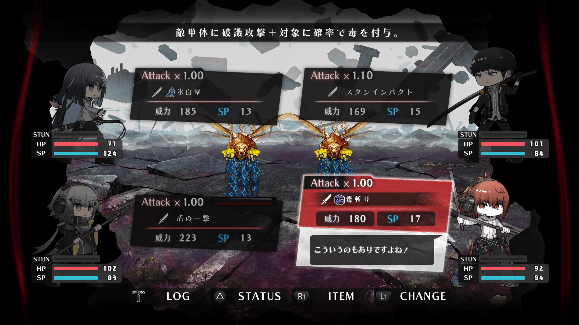 戦闘は、生徒たちが提案してくる行動のなかから、1ターンにひとつだけ行動を選択するコマンドバトル形式。プレイヤーは異能を失っているため戦闘には直接参加できませんが、的確な指揮で生徒たちを勝利に導く必要があります。