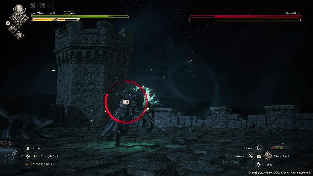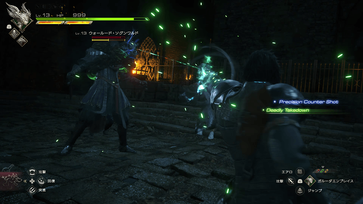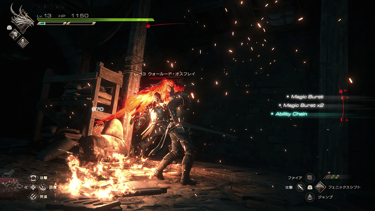 砦での戦いに話を戻そう。ベネディクタのもとにたどり着くまでの道中では、ウォールード兵との戦闘が幾度となく発生する。クライヴの攻撃は□ボタンの剣と△ボタンの魔法射撃を基本とし、タメ攻撃やジャンプ攻撃、コンボ攻撃や特殊技などのアクションに派生させつつ、そこに強力な召喚獣アビリティを組み込んでいく。召喚獣アビリティは再発動にクールタイムを要するが、ほかの召喚獣に切り替えることでアビリティを次々と放つといったやりくりも可能だ。